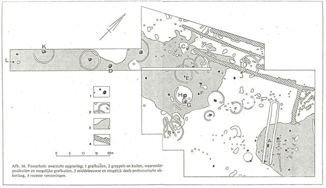 Ook werd nog een scherf gevonden van een “Kerbschnitt” urn. Nadien zijn in de omgeving door mij nog op meerdere plaatsen, voornamelijk net over de voormalige gemeentegrens van Posterholt en Vlodrop, plekken gevonden waar urnen (ca. 30) waren opgeploegd. Een 6-tal kon worden gerestaureerd. Één urn bevatte nog een klein potje met oor, een andere een klein bijpotje en een derde een rond amulet van aardewerk.